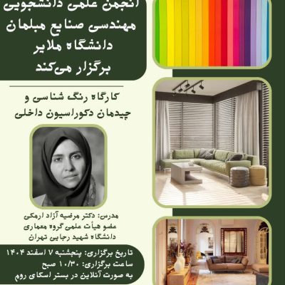 انجمن علمی دانشجویی مهندسی صنایع مبلمان دانشگاه ملایر برگزاری می کند: کارگاه آموزشی رنگ شناسی و چیدمان در دکوراسیون داخلی…