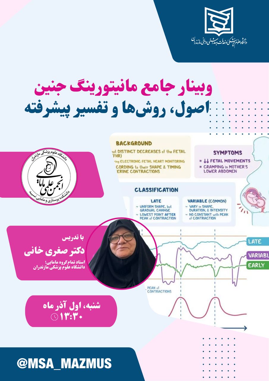 وبینار تخصصی مانیتورینگ جنین و تفسیر به همت انجمن علمی دانشجویان مامایی دانشگاه علوم پزشکی مازندران برگزار می‌شود.