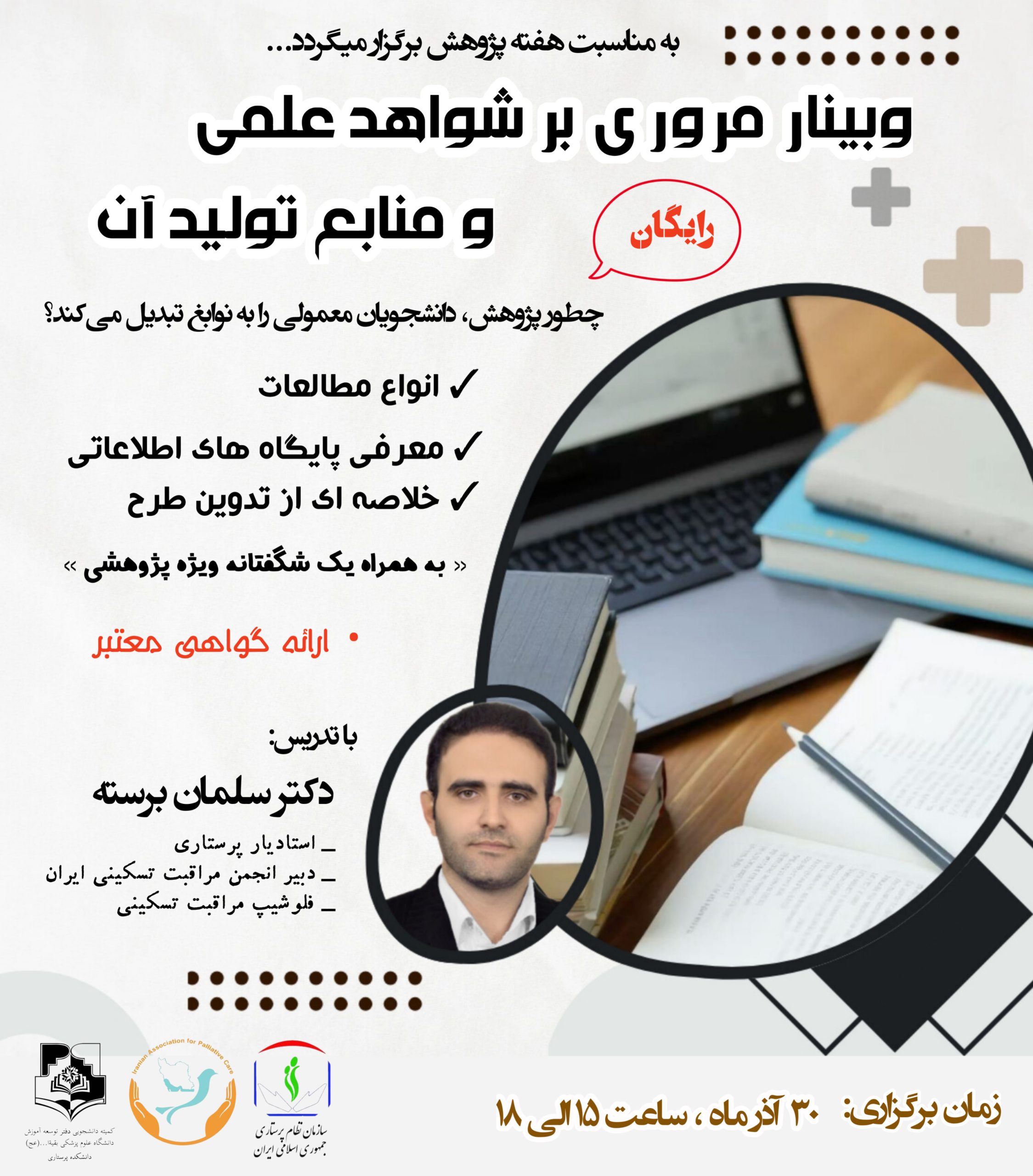 🎓 معاونت فرهنگی دانشجویی سازمان نظام پرستاری با همکاری انجمن علمی مراقبت تسکینی ایران و کمیته توسعه آموزش دانشکده پرستاری دانشگاه بقیه الله (عج)، به مناسبت هفته پژوهش به صورت کاملاً رایگان برگزار می‌کند...