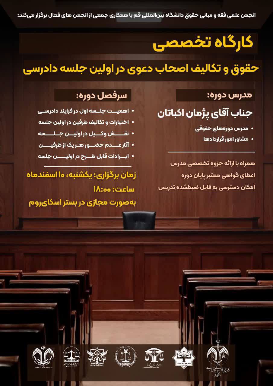 کارگاه تخصصی حقوق و تکالیف اصحاب دعوی در اولین جلسه دادرسی فعال از 1404/12/03 تا 1404/12/10