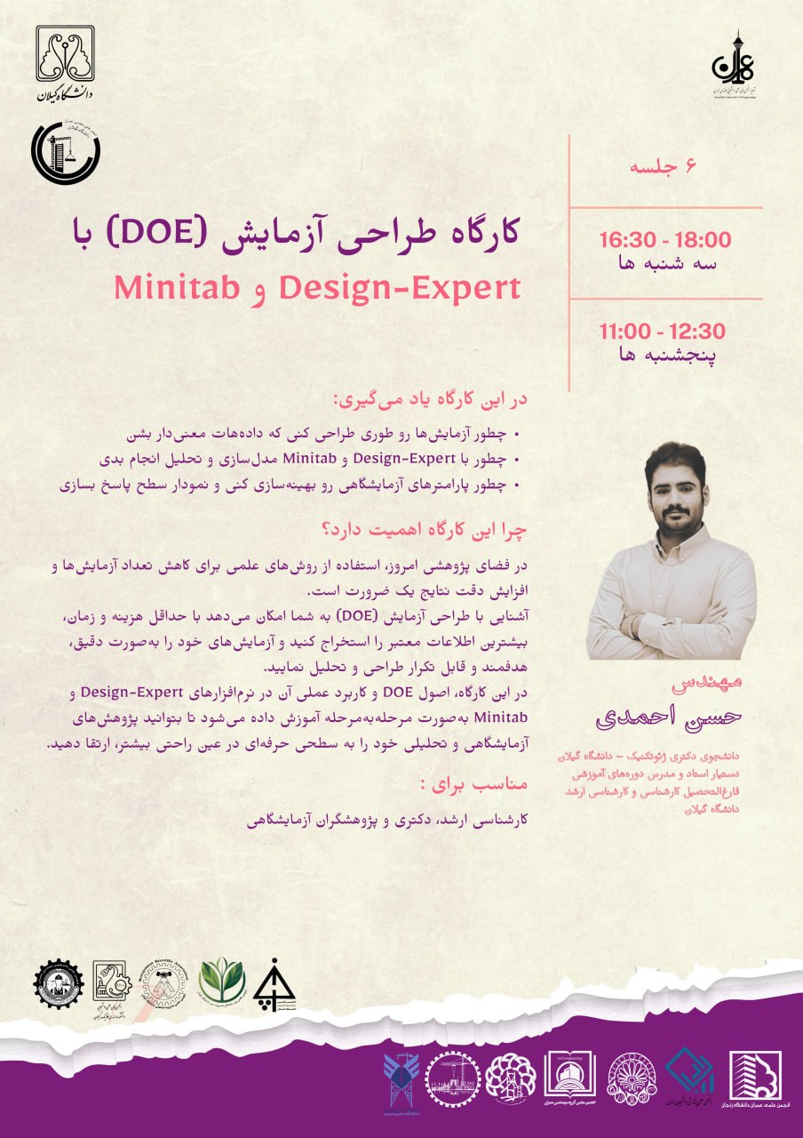 طراحی آزمایش[DOE]برای دانشجویان گیلان فعال از 1404/09/19 تا 1404/09/24