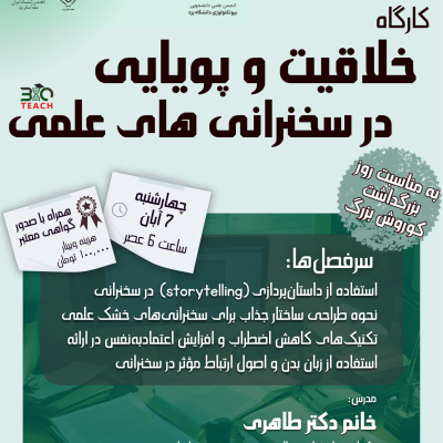✒️انجمن بیوتکنولوژی دانشگاه یزد با همکاری انتشارات چغازنبیل، برگزار میکند: کارگاه “خلاقیت و پویایی در سخنرانیهای علمی” مدرس: خانم…